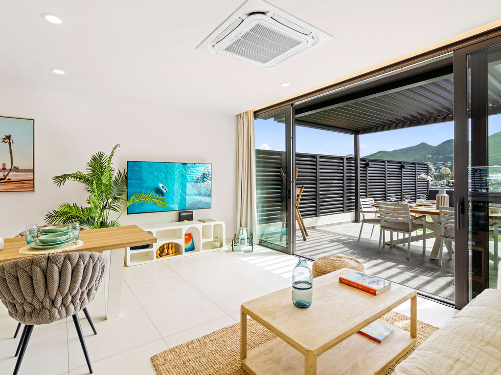 Apartment B205 at The Hills Residence in Simpson Bay offers a stylish one-bedroom retreat with a beautiful terrace.