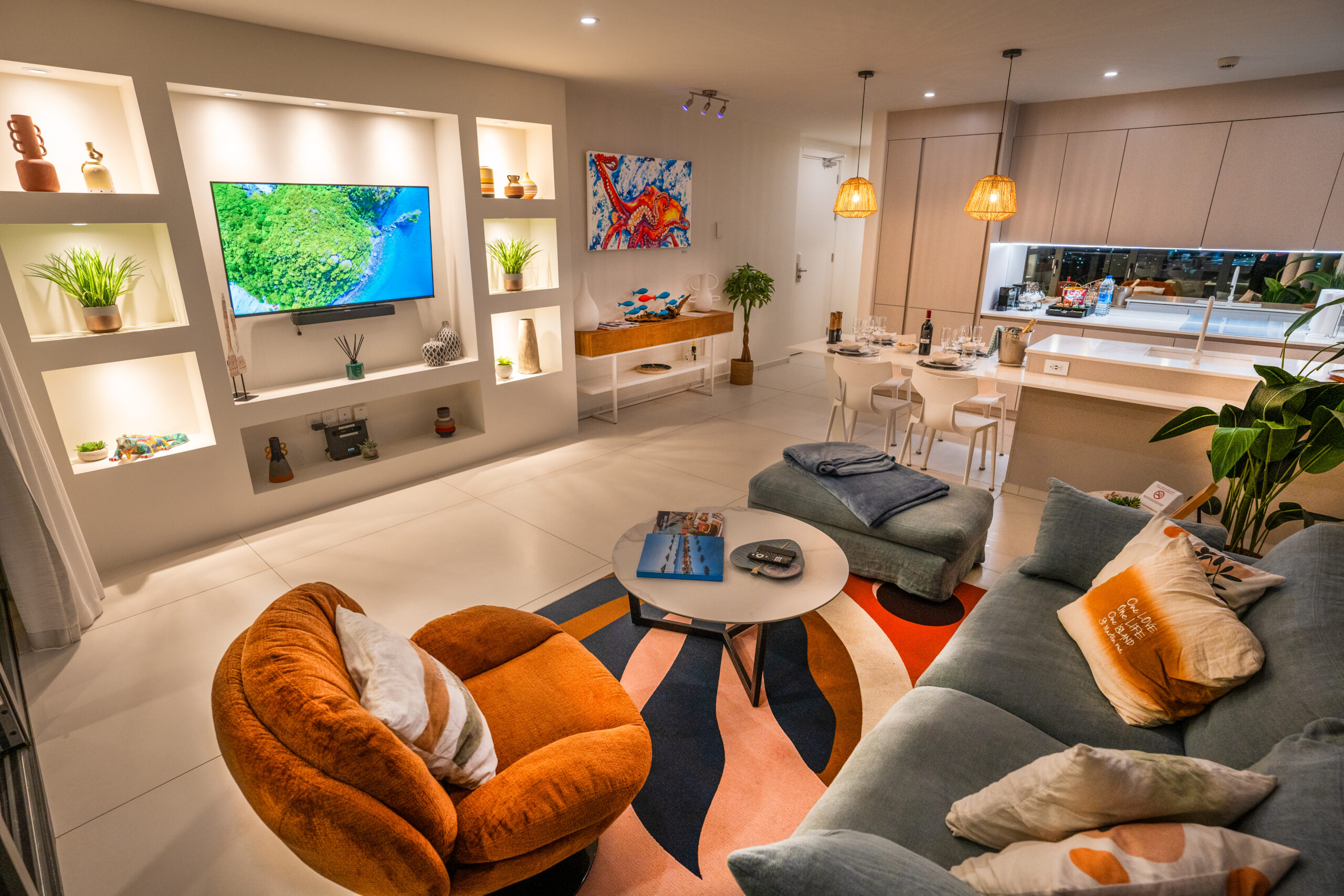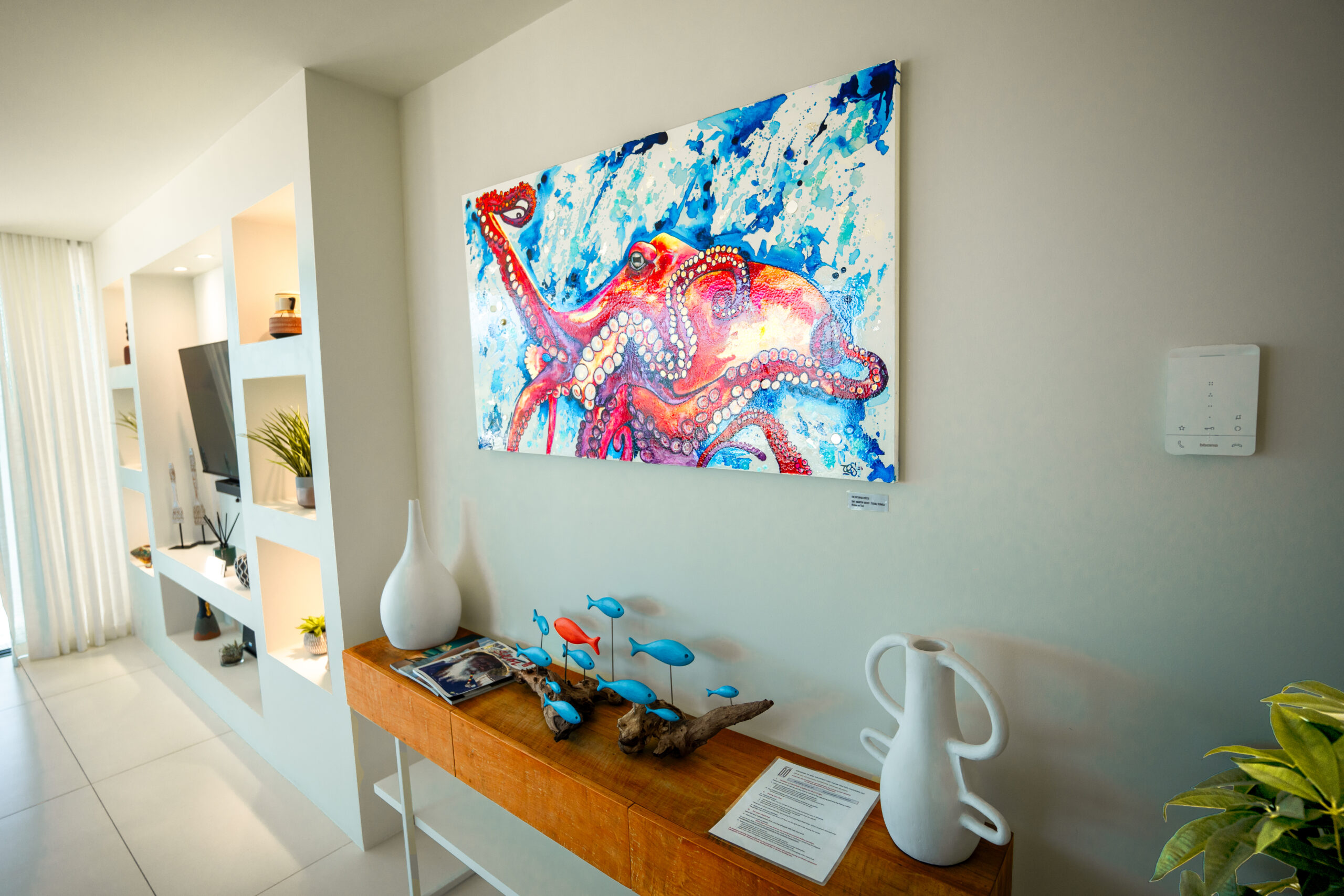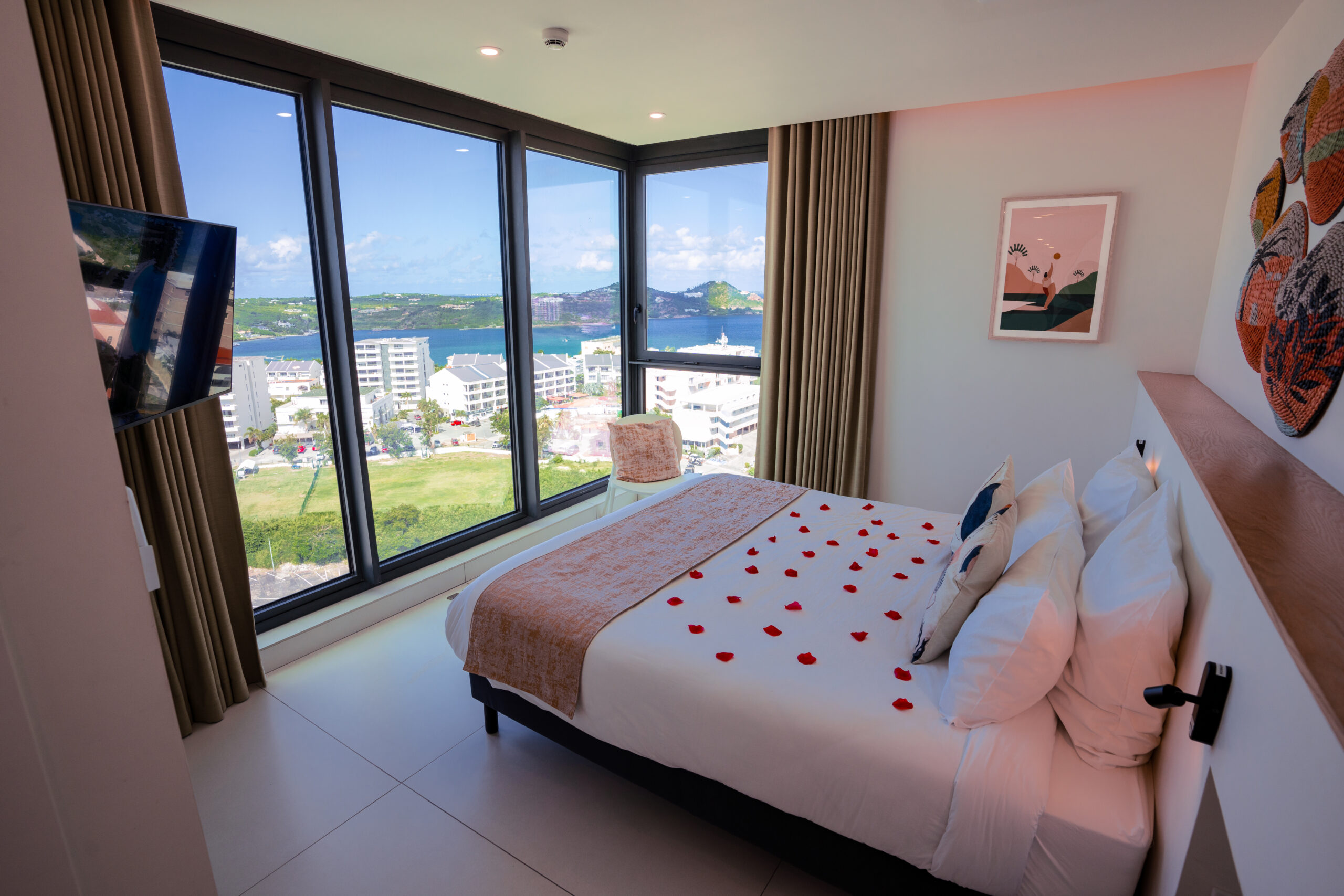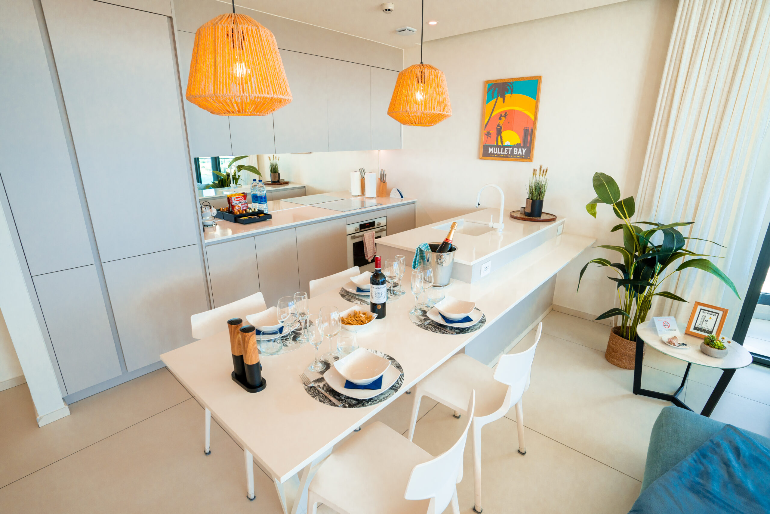 Chaque élément de ce condo a été méticuleusement conçu pour surpasser vos attentes. Les fenêtres du sol au plafond offrent des vues panoramiques à couper le souffle, visibles depuis le salon et les deux chambres. Meublée de fond en comble avec des pièces de grande qualité et des œuvres d’art locales uniques, dont l’incroyable « Neon Octopus » de Tess, une artiste de Saint-Martin, cette maison est un véritable joyau tropical moderne.