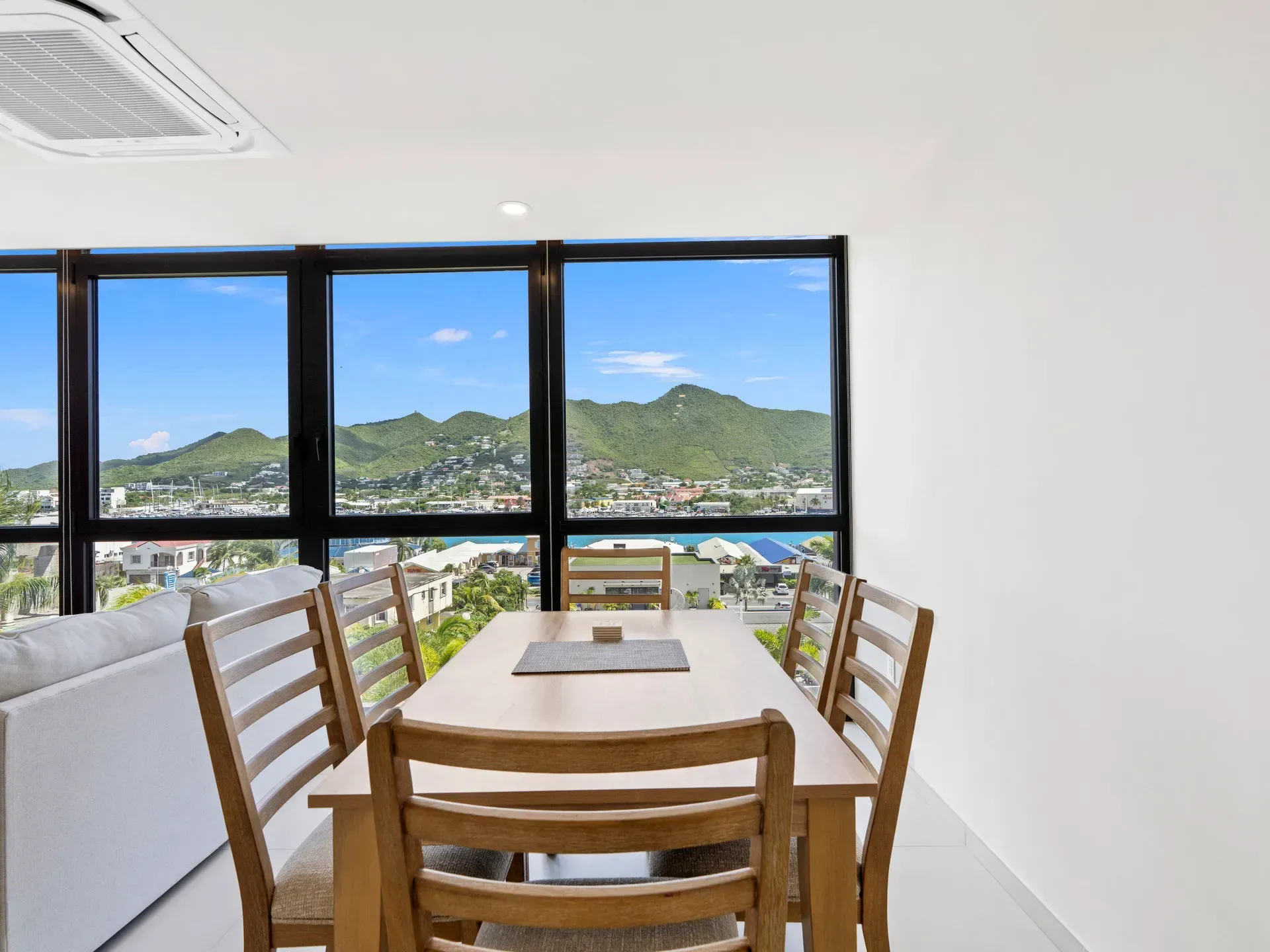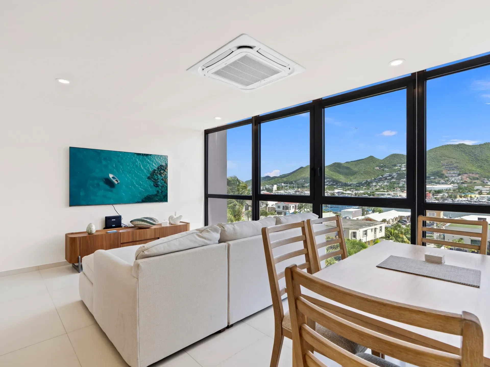 Salon spacieux avec grande baie vitrée laissant entrer la lumière naturelle et offrant une magnifique vue sur le lagon de Simpson Bay