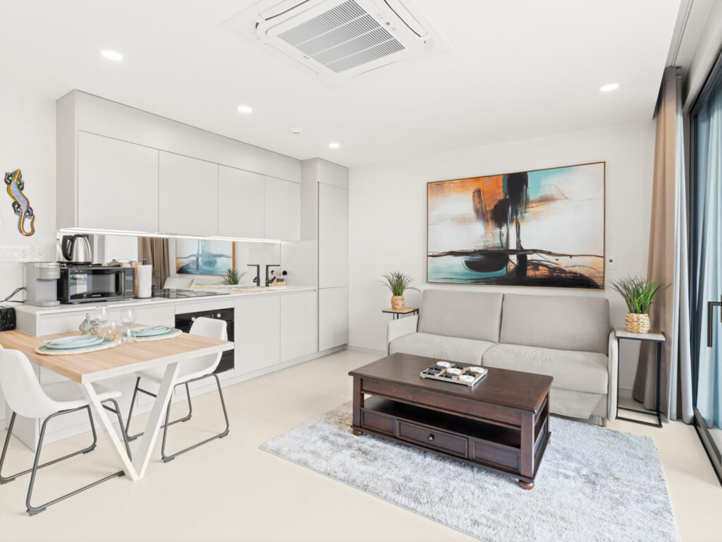 Le cœur de l’Appartement B-214 est sa cuisine bien équipée, conçue pour satisfaire tous vos besoins culinaires. Elle dispose d’appareils modernes, y compris une élégante machine à expresso pour votre café du matin, un lave-vaisselle pour faciliter le nettoyage et une machine à laver pour garder vos vêtements frais tout au long de votre séjour. Les passionnés de cuisine apprécieront la disposition pratique et l’espace de comptoir ample, rendant la préparation des repas agréable.