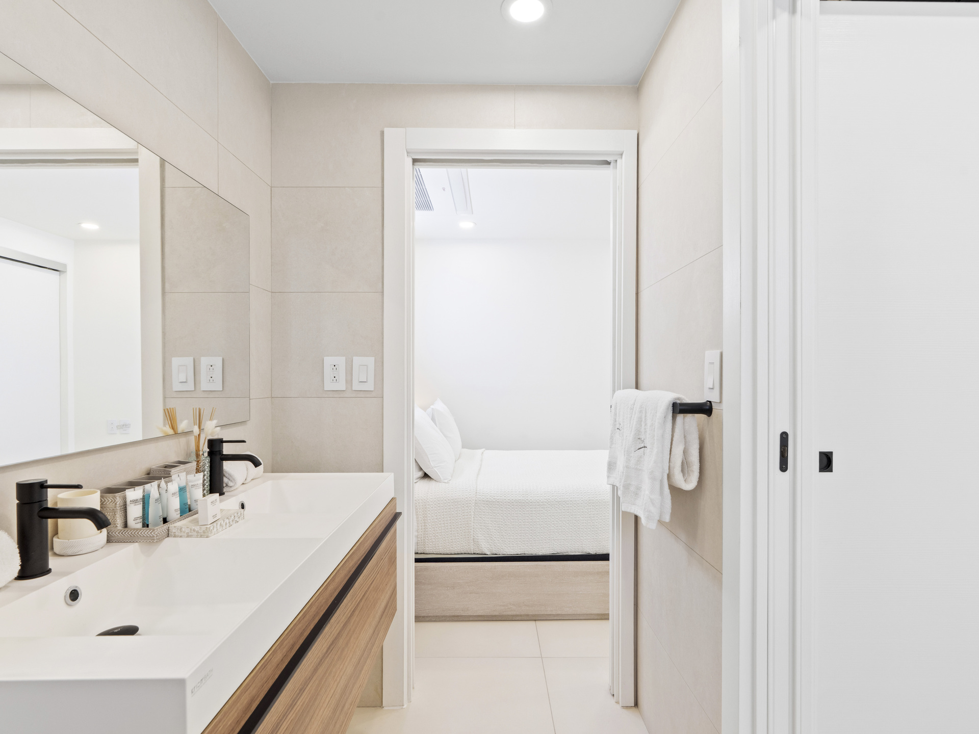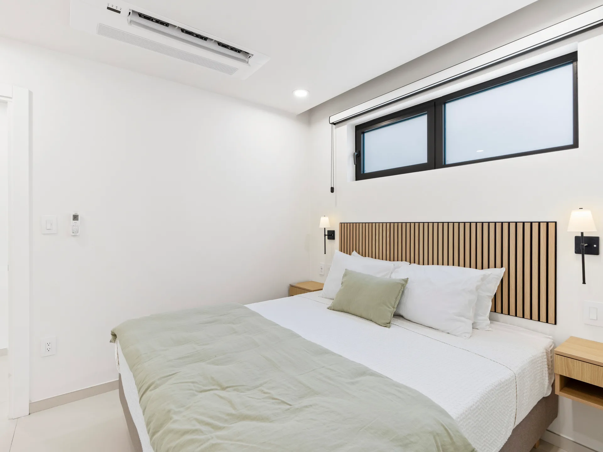 La chambre principale dispose de grandes fenêtres baignant l’espace de lumière naturelle et d’une salle de bain attenante avec une simple vasque et une luxueuse douche à effet pluie.