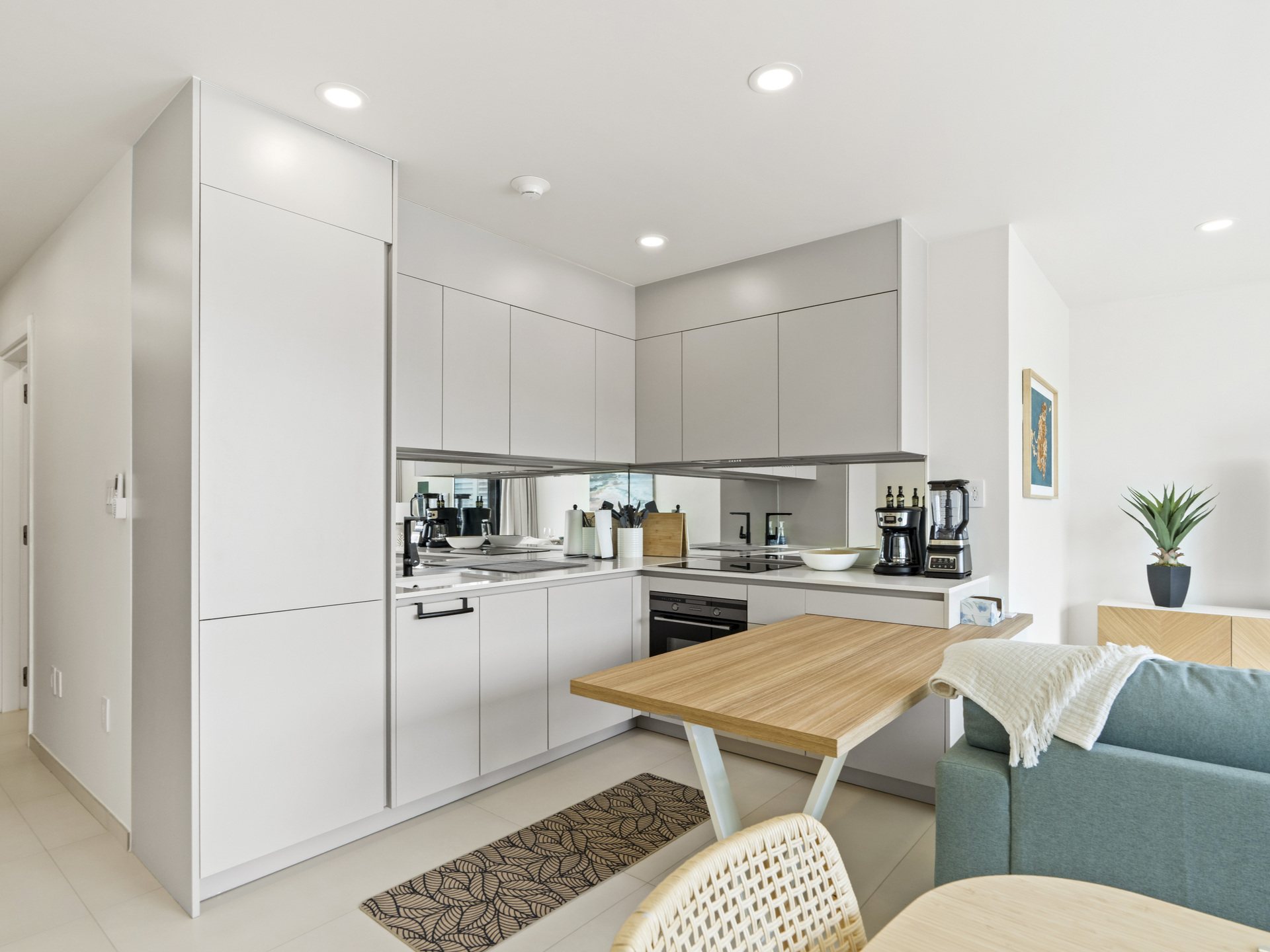 Cuisine moderne entièrement équipée d’électroménagers haut de gamme, d’armoires élégantes et d’un grand plan de travail — idéale aussi bien pour des repas décontractés que gastronomiques.