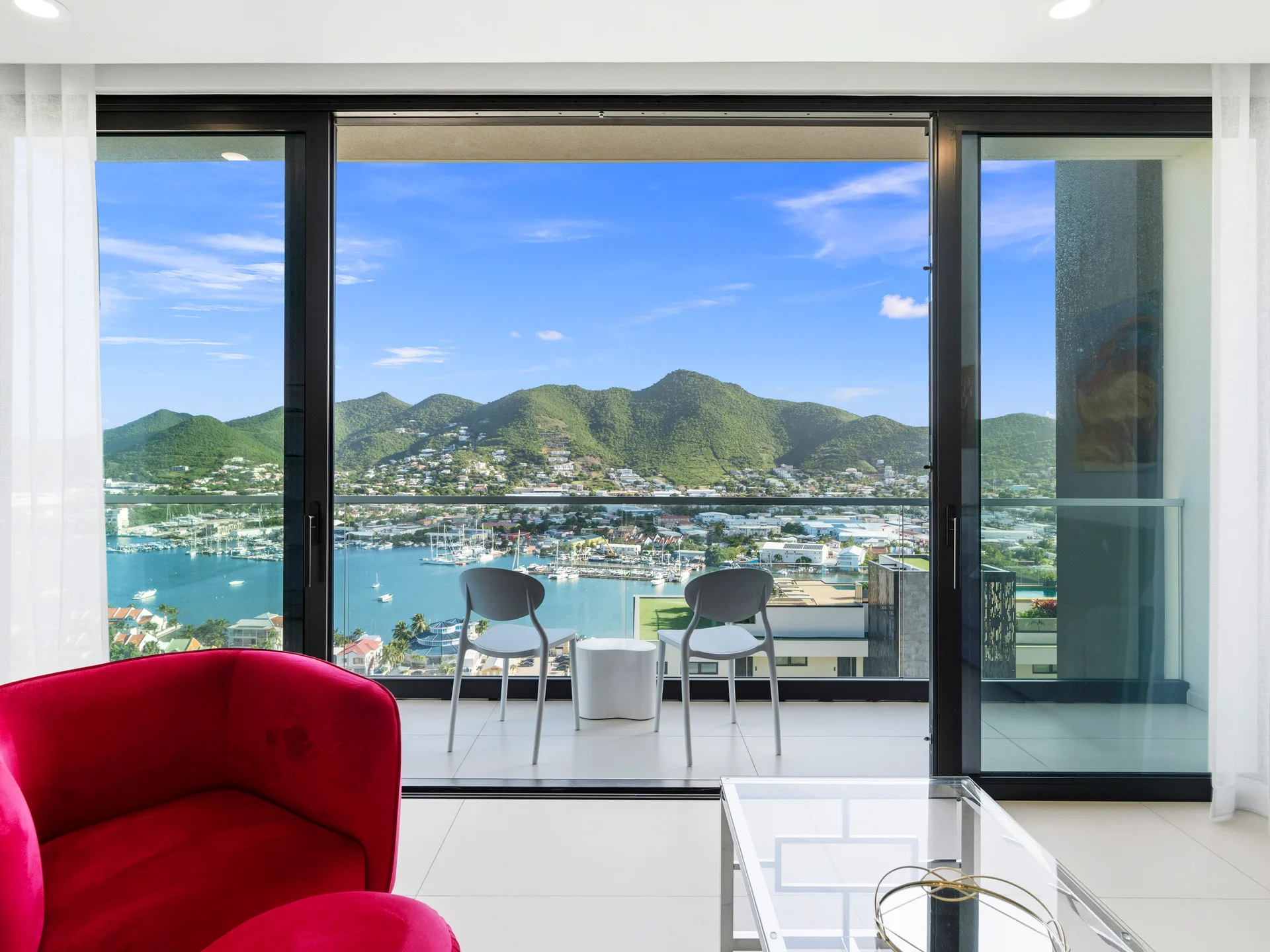 Vue imprenable sur le lagon de Simpson Bay — parfait pour un café matinal ou un cocktail au coucher du soleil