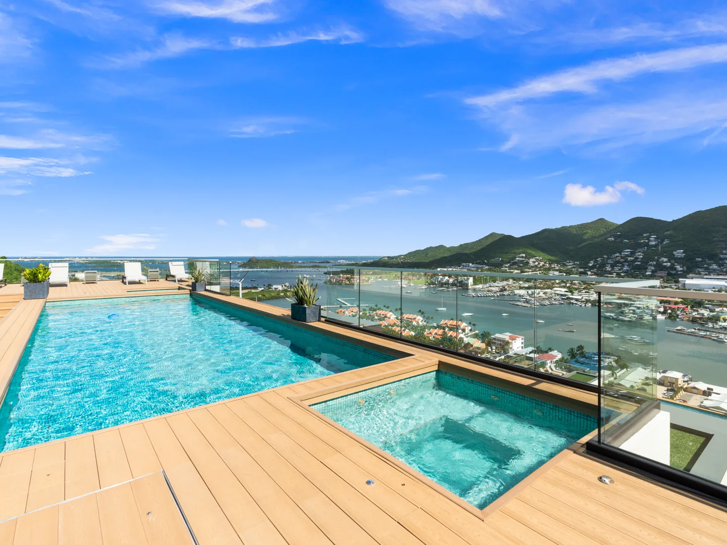 Salon lumineux offrant une belle vue sur le lagon de Simpson Bay, parfait pour se détendre et profiter de l’ambiance caribéenne.