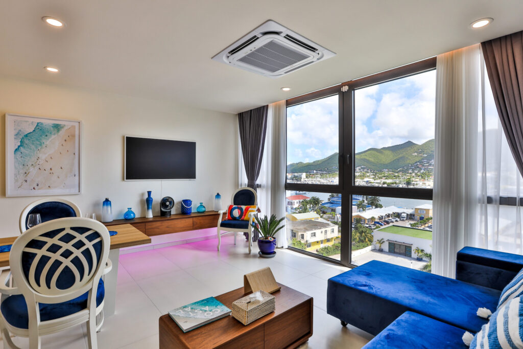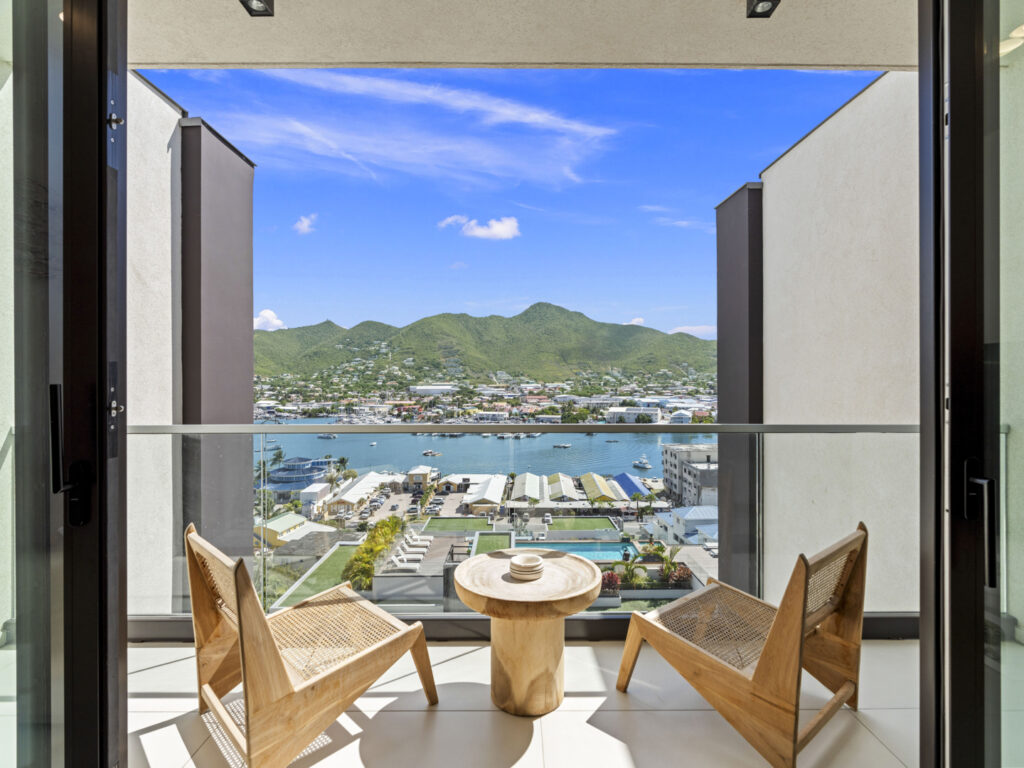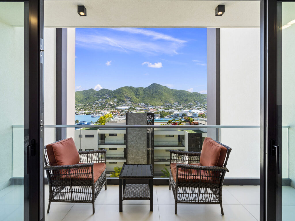 B253, a deluxe one-bedroom apartment perched on the 5th floor of Building 2 at The Hills Residence in Simpson Bay, Sint Maarten.