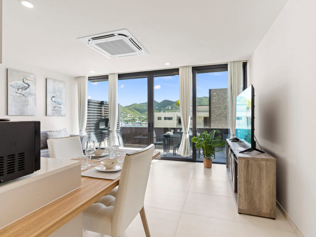 As you enter B205, you’re welcomed by a meticulously designed interior that blends modern aesthetics with a cozy appeal. The open-plan living area, furnished with chic pieces and flooded with natural light, creates a warm atmosphere ideal for unwinding after a day of exploring the island.