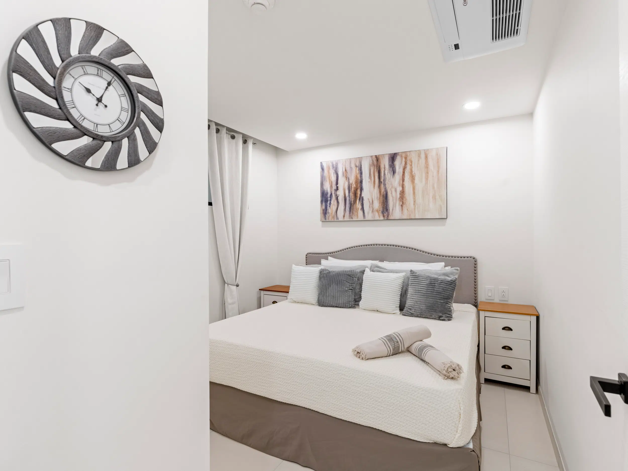 The bedroom is a tranquil retreat, complete with a luxurious bed that guarantees restful nights. High-quality linens and ample storage further enhance comfort and convenience during your stay.