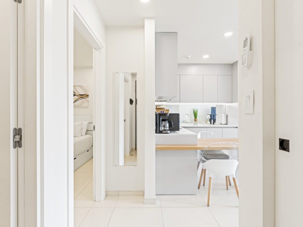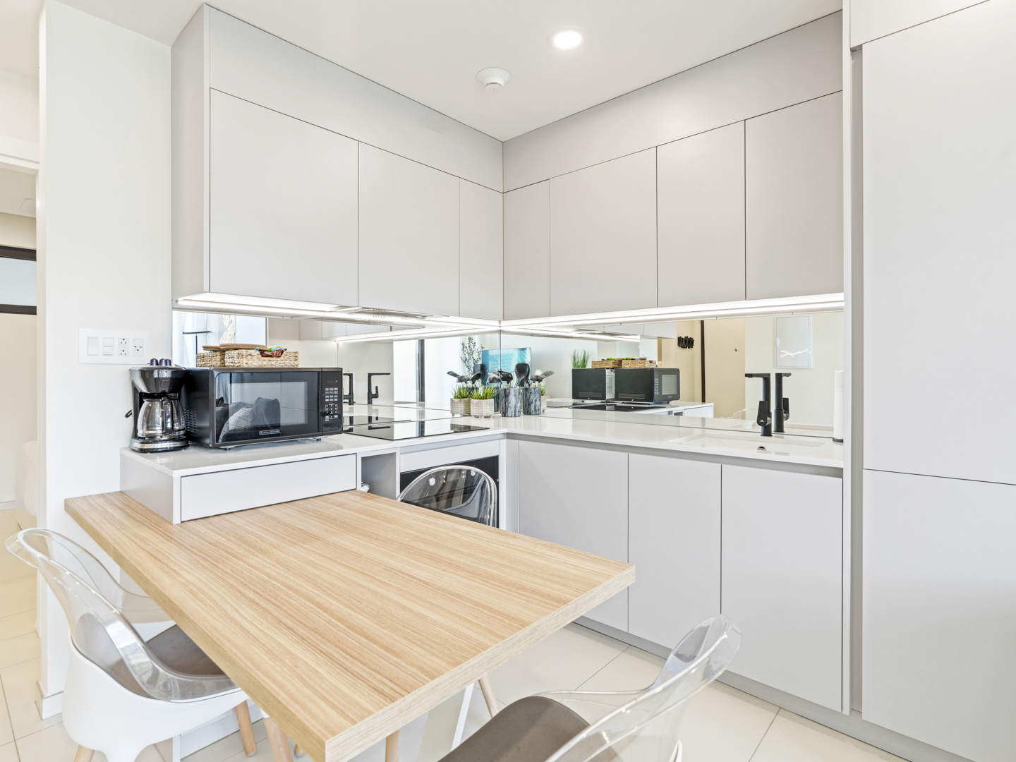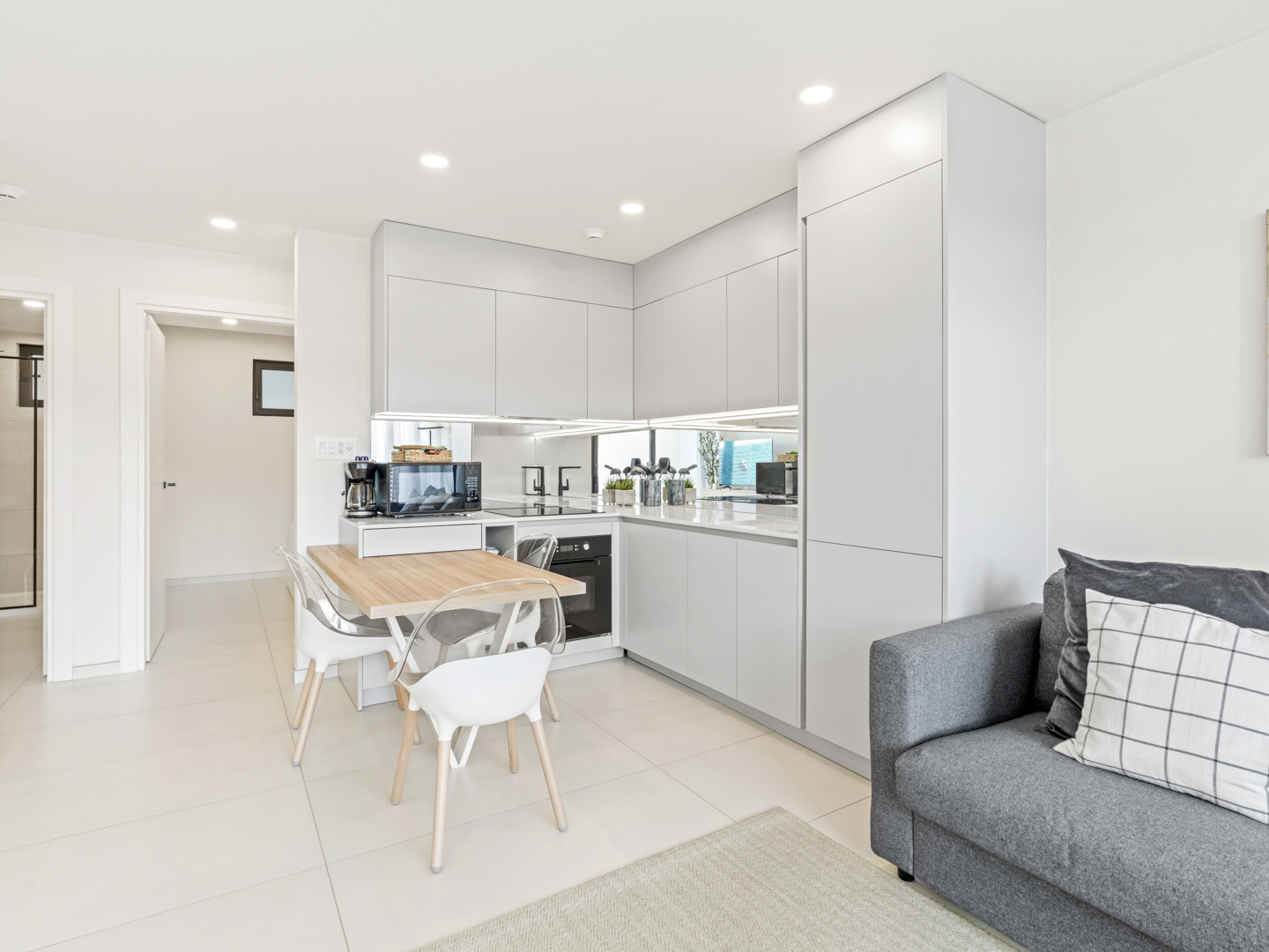 The fully equipped, modern kitchen is ready for anything from quick breakfasts to gourmet dinners. State-of-the-art appliances and a seamless layout ensure that every culinary experience is a pleasure, all while staying connected to the living area.