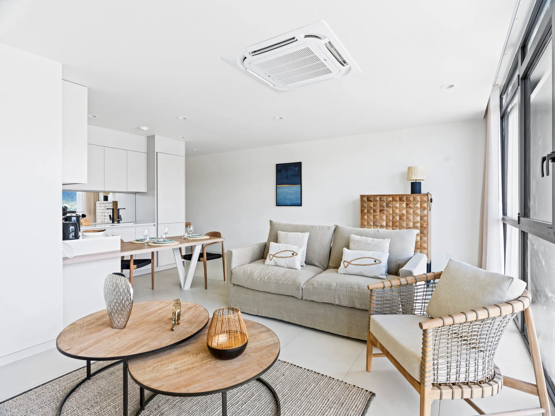 We are delighted to present our stunning two-bedroom apartment, located on the second floor of The Hills residence. With its 75m² of elegant space and its glass wall offering a breathtaking view of the lagoon, this apartment is a real gem.
