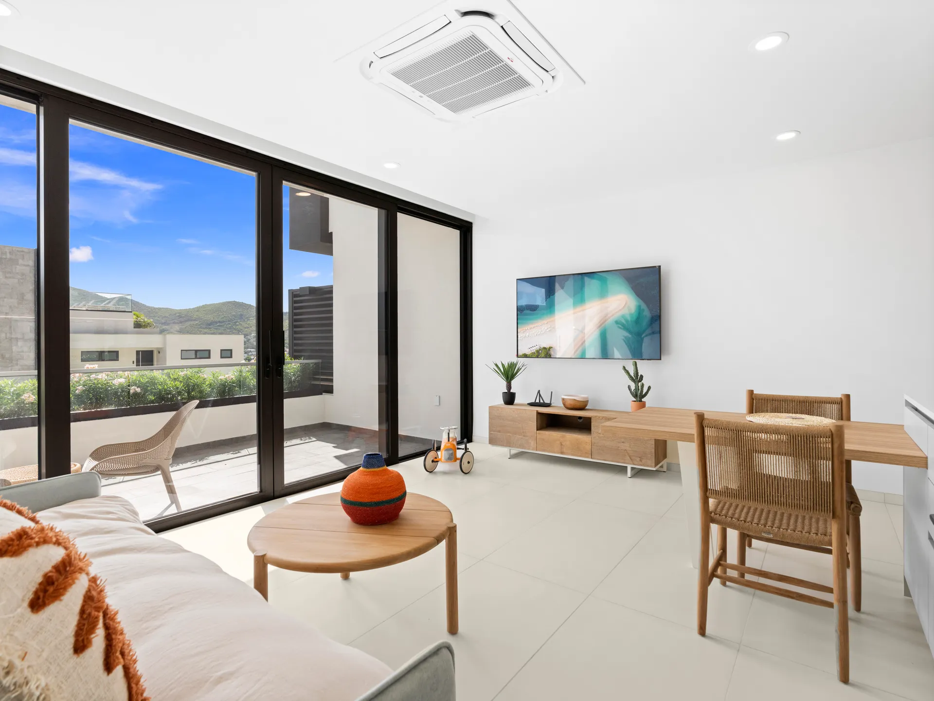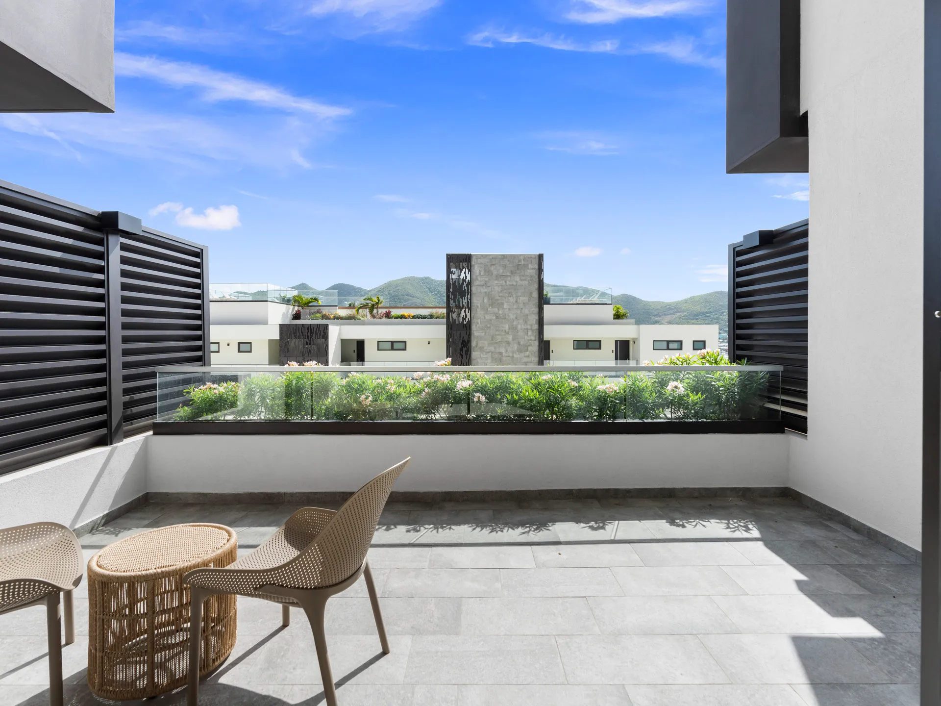 - Expansive outdoor terrace โ the largest in Building Two โ ideal for relaxing on plush loungers, sipping cocktails at the high-top bar, or dining al fresco with serene lagoon views