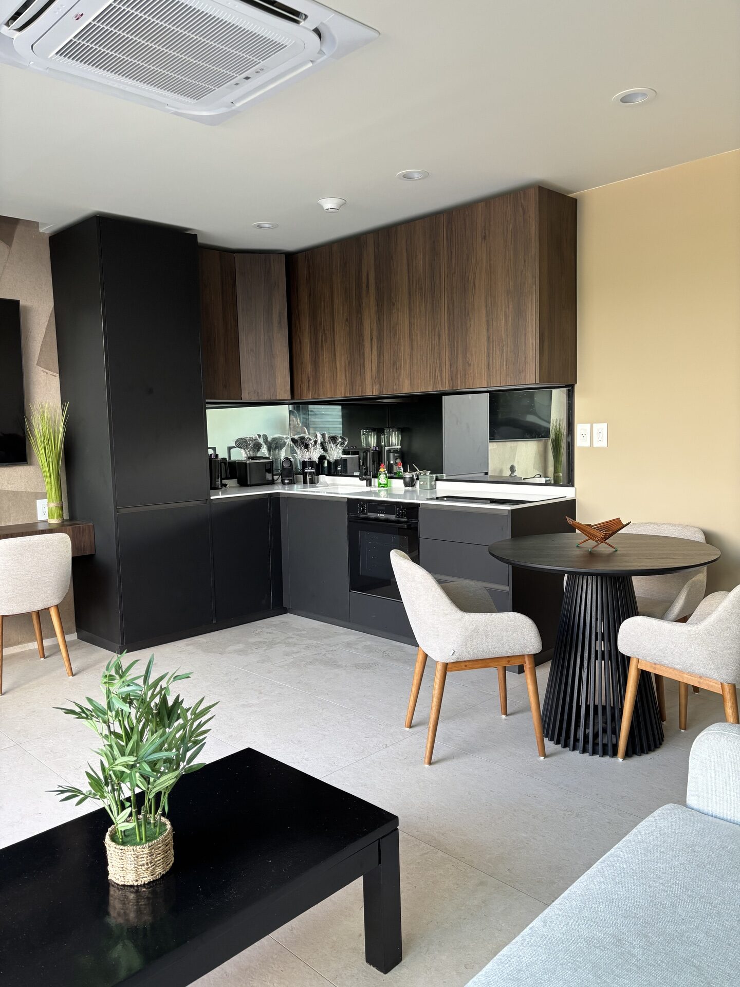 Fully equipped kitchen with all essential appliances: refrigerator, oven, microwave, dishwasher, stovetop, and cooking utensils — ideal for preparing meals with ease and convenience.