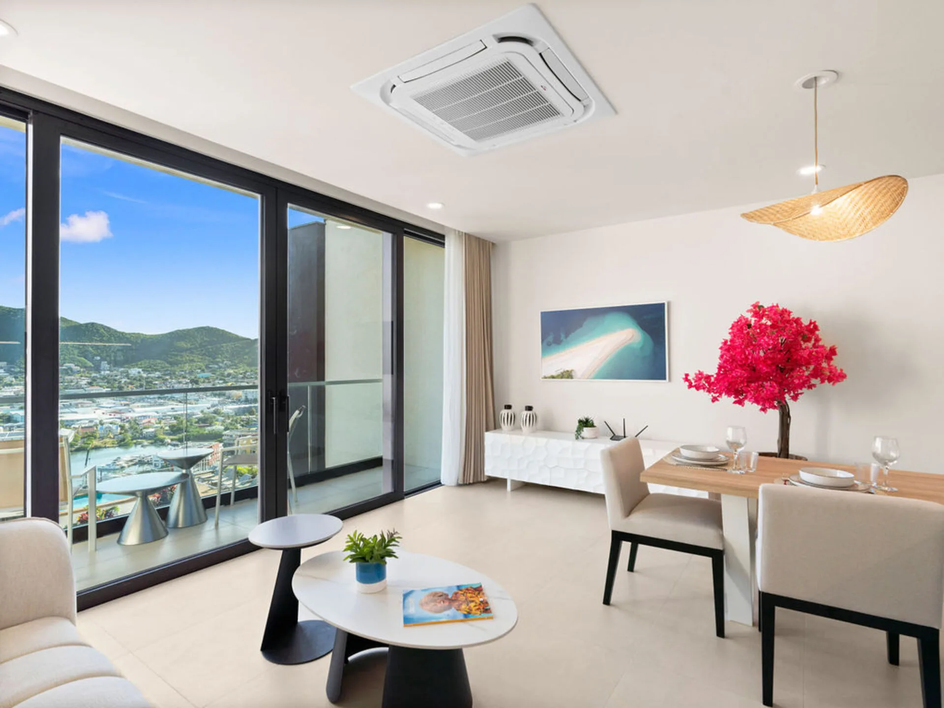 Private balcony accessible from the living area with lagoon views — perfect for relaxing and enjoying the Caribbean breeze