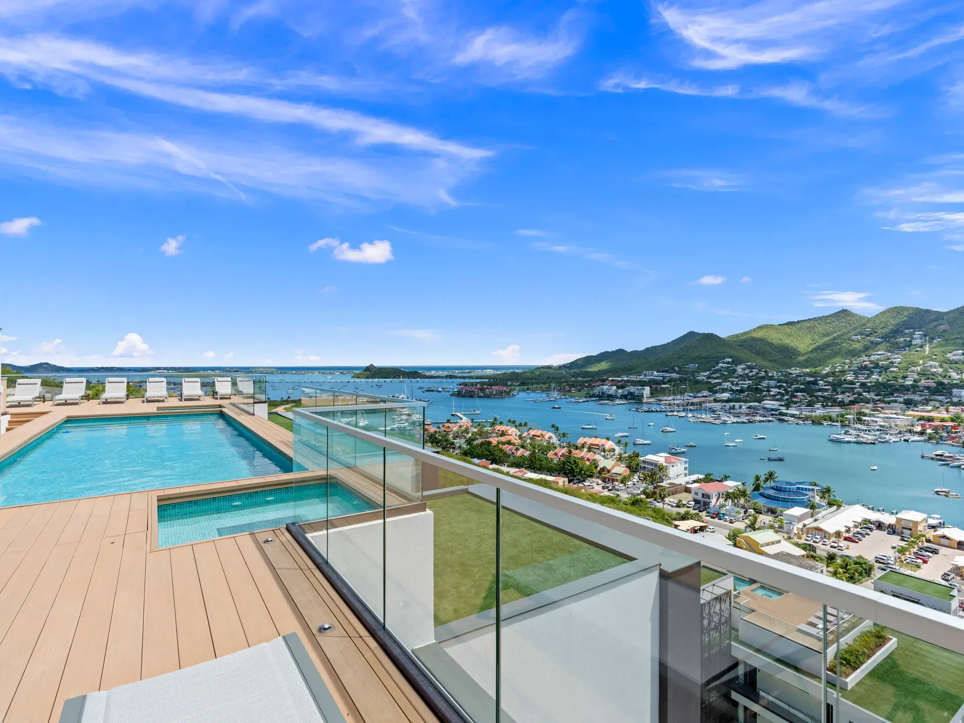 Located in Simpson Bay, close to beaches, restaurants, shops, and nightlife. Offers peace, privacy, and stunning panoramic views from the top floor.